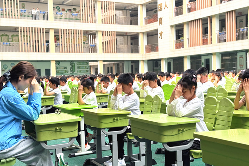 眼保健操比赛在天井进行,同学们闭眼认真按揉穴位,动作轻柔规范,井然有序。