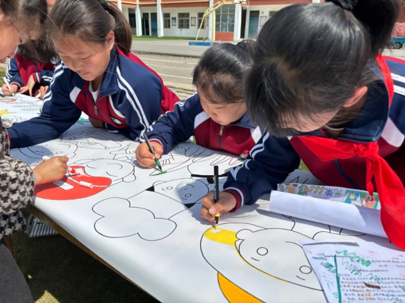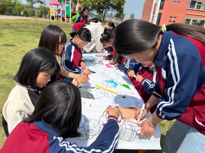 活动具体分为两个阶段。首先,学生们在涂鸦画布上尽情挥动画笔,运用缤纷多彩的颜色,生动描绘出医护人员救死扶伤、环卫工人清扫街道、建筑工人搭建高楼等劳动者辛勤工作的场景,将对劳动者深深的敬意毫无保留地倾注于每一笔触之间。