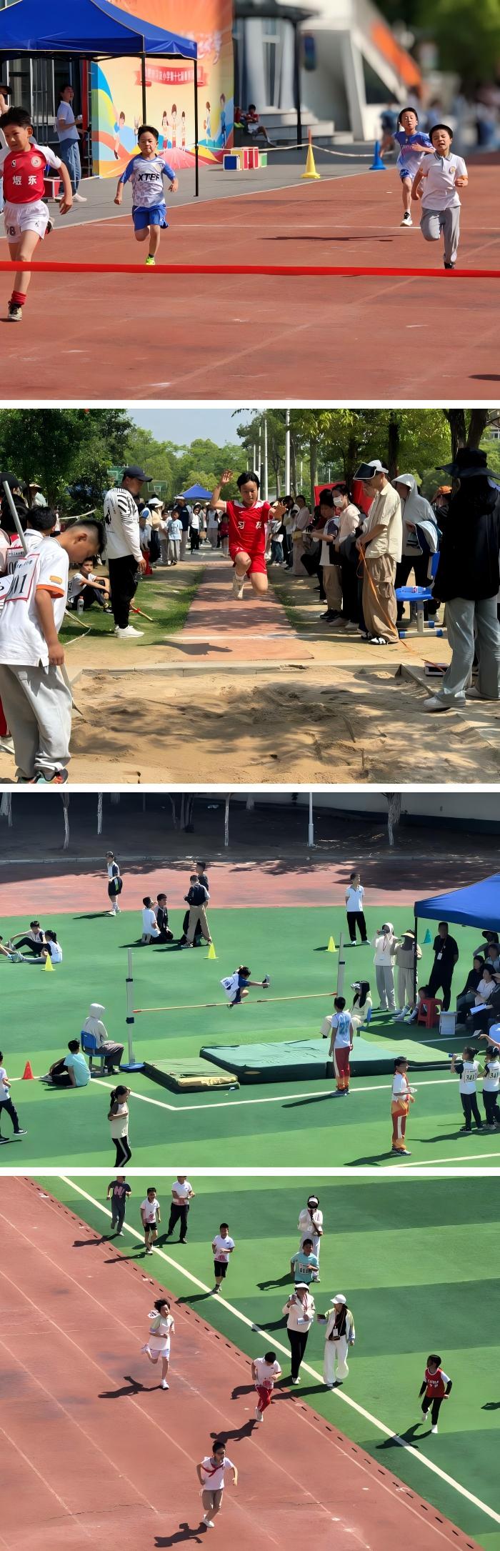 跑道上,孩子们迎着阳光奋力奔跑,每一步都充满力量与勇气。跳高区,选手们如飞燕掠过横杆;跳远沙坑旁,助跑、起跳、落地,划出优美弧线;接力赛中,交接棒的默契传递着团结的力量。全校师生与家长志愿者热情呐喊,共同见证一个个精彩瞬间。