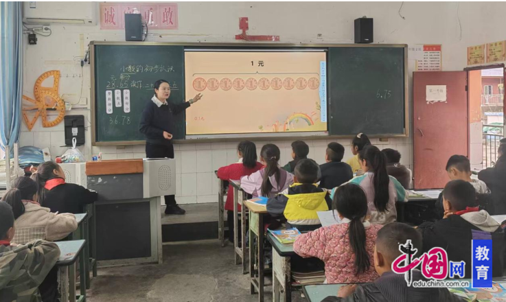 送教环节,王倩老师执教《小马过河》。孩子们围坐成圈,通过角色扮演、互动问答,感受寓言故事的智慧。王老师用生动的语言和情景模拟,引导孩子们思考“实践出真知”,课堂笑声不断,举手如林。余锦春老师执教《小数的初步认识》,将抽象概念与生活场景结合。孩子们用尺子测量书本长度、计算零食价格,在动手实践中理解小数的意义。