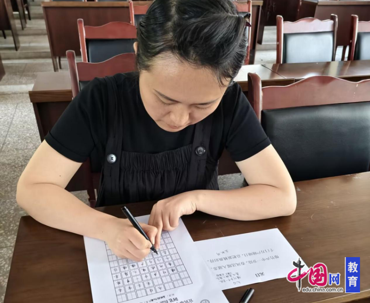 比赛分钢笔字、毛笔字、粉笔字三个项目同步进行。在钢笔字赛场,教师们专注书写指定文本,字迹或清秀灵动,或刚健洒脱,将日常教学中的严谨与细致融入笔端。