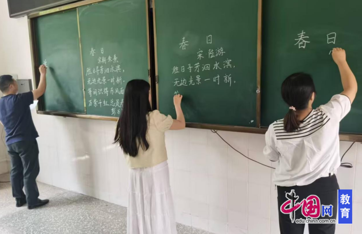 粉笔字环节,教师们在黑板上精心布局,以遒劲笔法书写诗词名句,让单调的黑板化作流动的艺术载体。