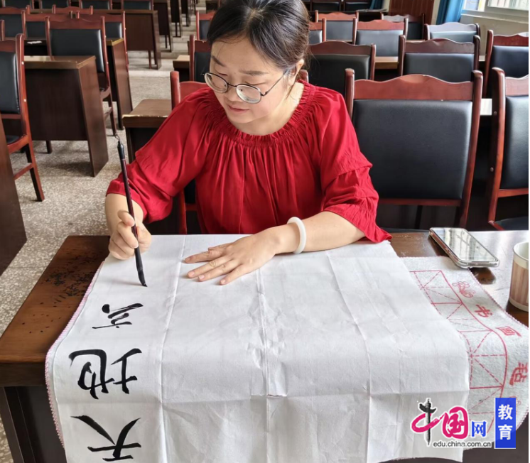 毛笔字书写区域,宣纸铺展,墨香四溢。教师们挥毫泼墨,篆书、隶书、楷书、行书、草书各显神韵,《诫子书》《劝学》等经典篇目在笔下焕发生机。