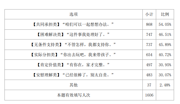 其次:共同承担,是解锁幸福的关键密码。在调研中,当被问及“您最喜欢丈夫表达的支持类型与话语”,妈妈们最渴望听到的不仅仅是安慰,而是和爸爸共同承担和解决困难。有54.05%的妈妈选择“咱们可以一起想想办法”,46.51%选择“这件事我处理好了”,45.89%选择“不管怎样,我都支持你”……这种并肩作战的温暖,在幸福感较高的群体中表现更为突出。而“嗯,哦,随便你”“这又不关我的事”“这点事都做不好”则成为妈妈最反感爸爸说的话,且低幸福感群体对此类冷暴力及推责的抵触情绪更强烈。