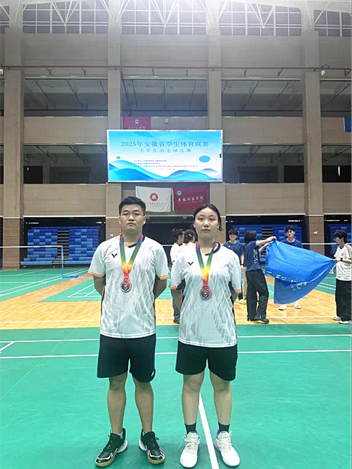 近日,由安徽省教育厅、安徽省体育局联合主办的2025年安徽省大学生羽毛球比赛圆满落下帷幕。在基础部体育教研室和学工部的精心组织与带队下,安徽扬子职业技术学院参赛队伍表现亮眼,其中信息工程学院文张杰同学与学前教育学院桑彩云同学组成的混双组合,凭借精湛的球技和顽强拼搏的精神,一路过关斩将,最终荣获混合双打项目全省第二名的优异成绩,为学校赢得了荣誉。