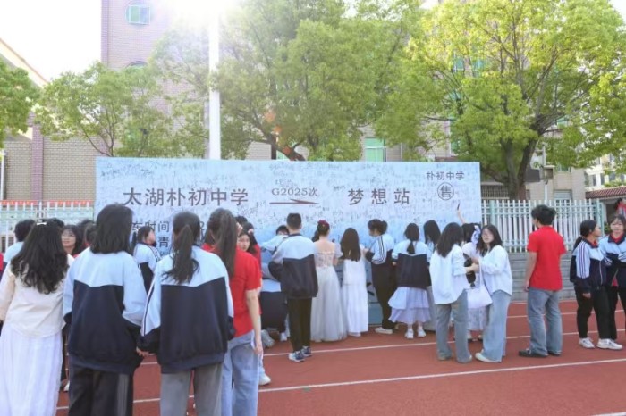 清晨8时,学生与家长在主席台东侧签名墙前合影留念。朴初是他们追梦的起点,一张张签名承载着对青春的纪念与未来的期许。