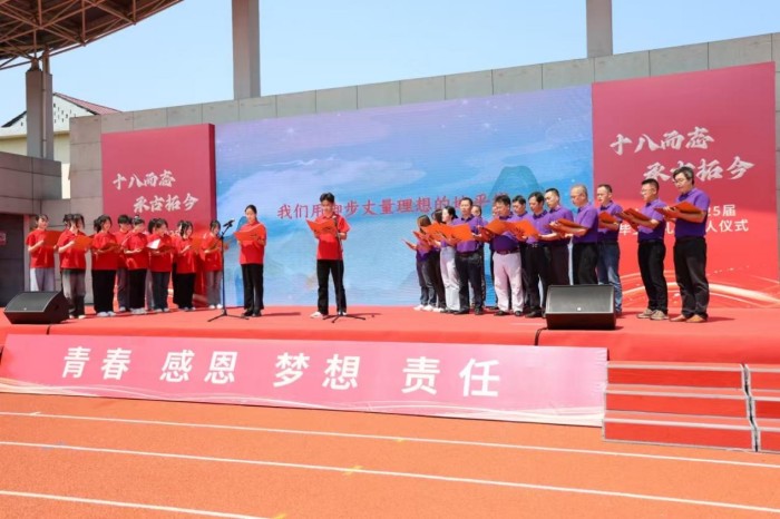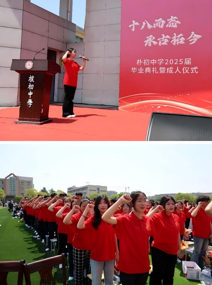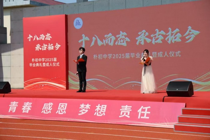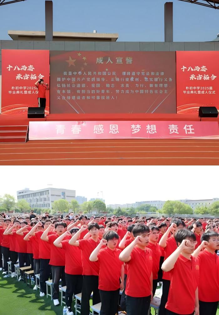 5月11日上午,太湖朴初中学2025届毕业典礼暨“十八而志,承古拓今”成人礼仪式在运动场隆重举行。校党总支书记陈超、校长汪君,副校长严子康、鲁林益,二级机构负责人,全体师生、家长齐聚校园,共同见证这个庄严时刻。活动由“成人篇”“同学缘”“父母恩”“师生谊”“母校情”五大篇章组成,将传统文化与现代精神交融,为毕业生镌刻下难忘的青春印记。