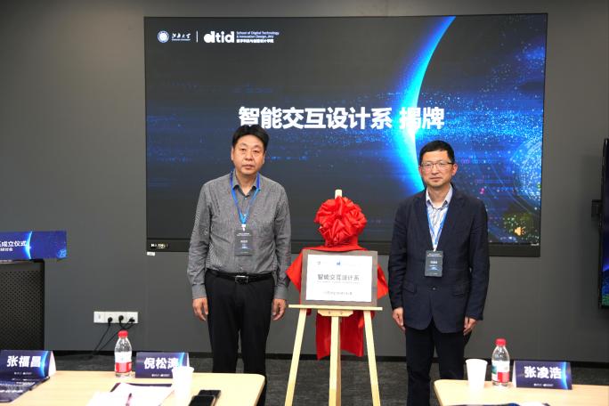 张凌浩、倪松涛为智能交互设计系揭牌,倪松涛向江南大学智能交互设计系主任沈杰授牌。