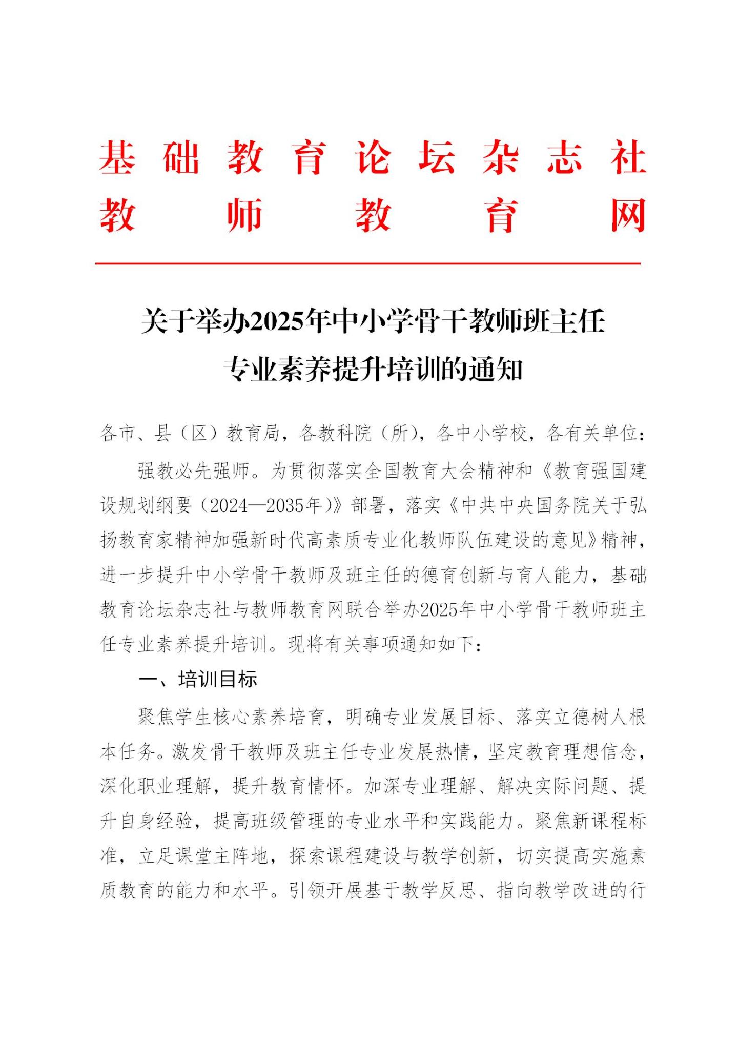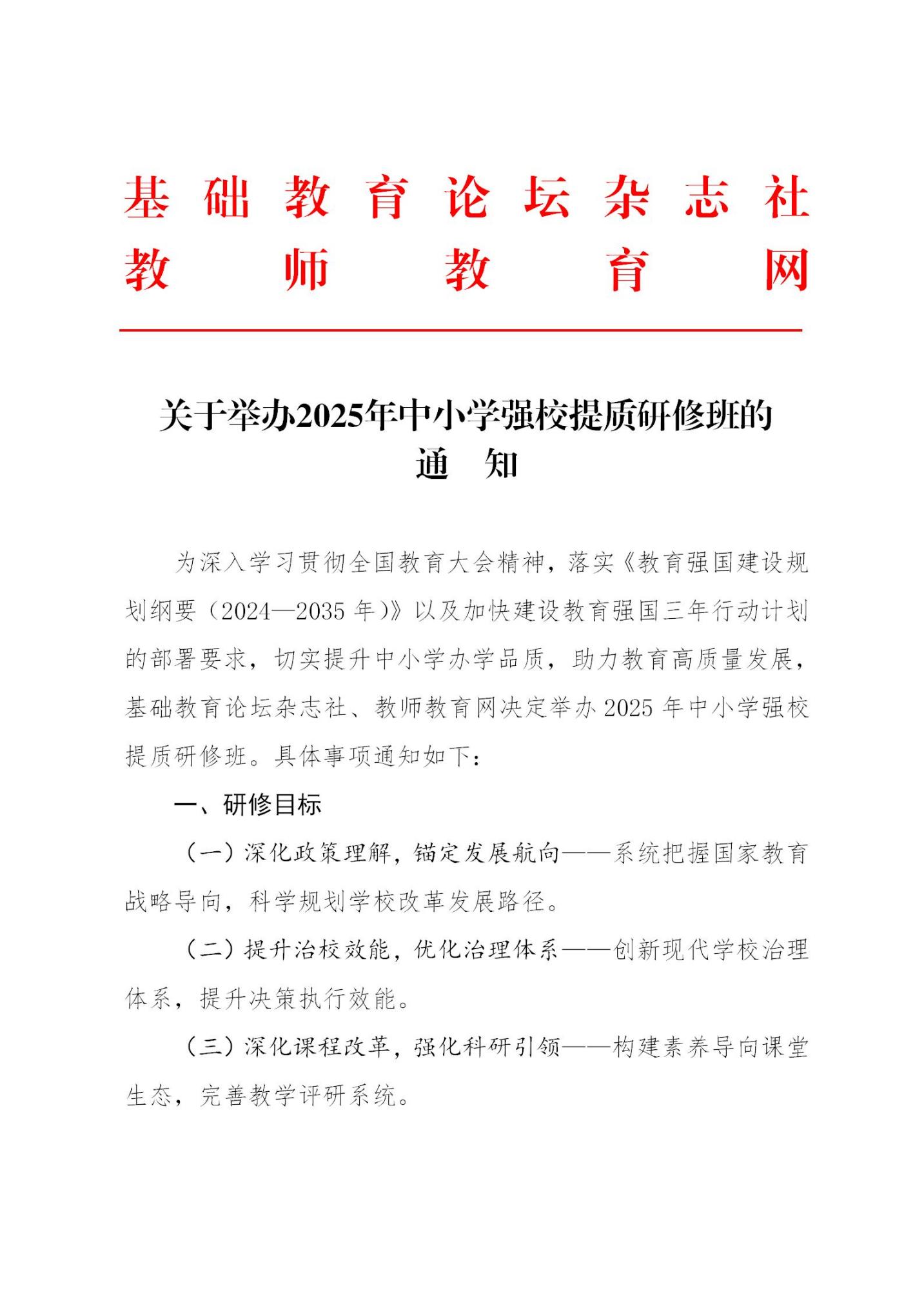 基础教育论坛杂志社与教师教育网将在今年暑期举办系列专题研修活动。旨在深入贯彻全国教育大会精神,全面落实《教育强国建设规划纲要(2024—2035年)》及加快建设教育强国三年行动计划工作要求,切实提升中小学骨干教师及班主任队伍的德育创新能力与综合育人水平,进一步提高中小学办学品质,助力教育高质量发展。