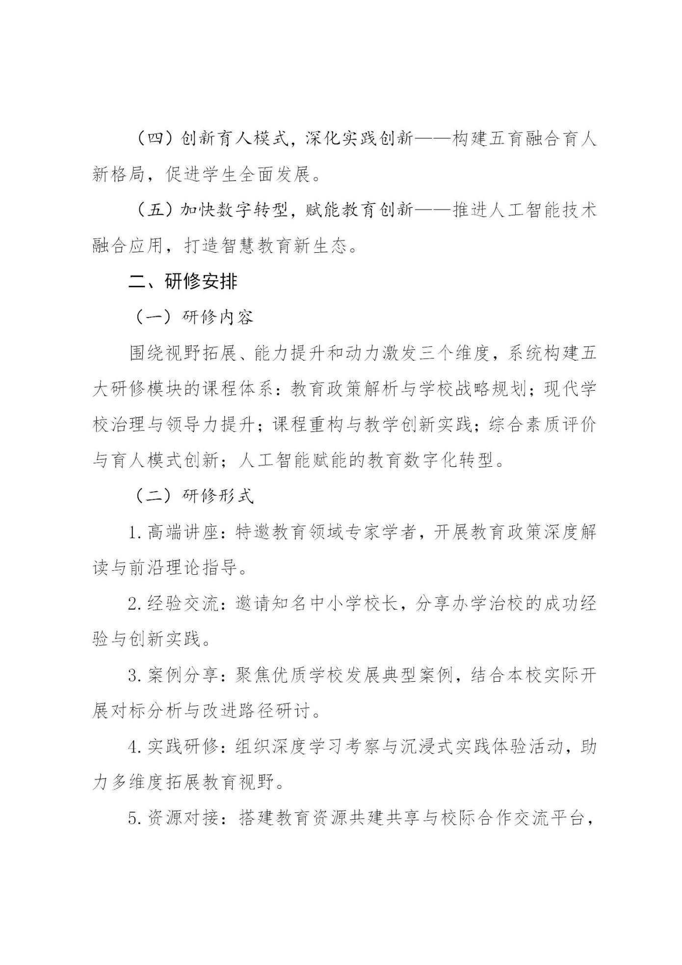 研修内容:教育政策解析与学校战略规划;现代学校治理与领导力提升;课程重构与教学创新实践;综合素质评价与育人模式创新;人工智能赋能教育创新发展等。