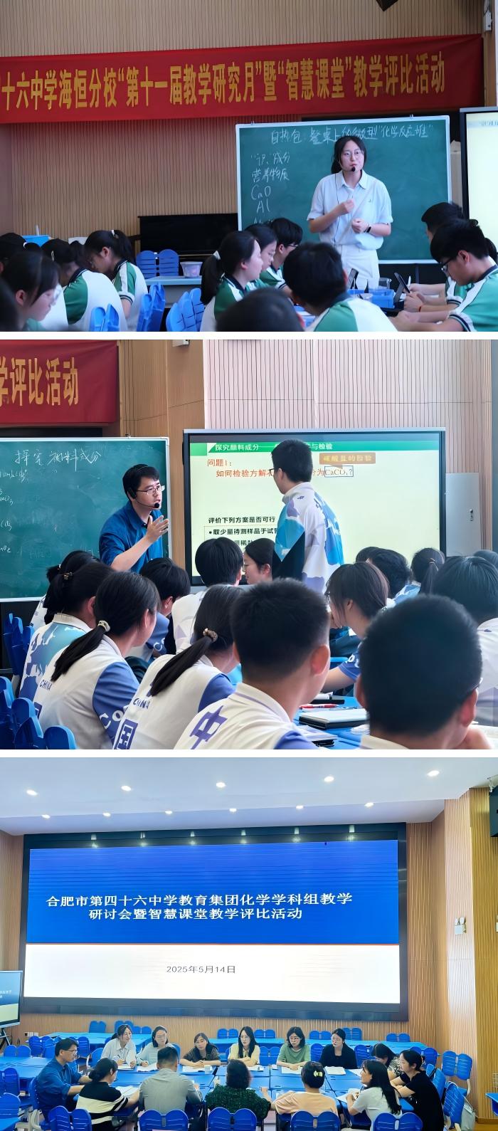 梅香浸润课堂间,海纳智慧启新程。恰逢合肥市第四十六中学海恒分校第十一届教学研究月暨“智慧课堂”教学评比大赛开展期间,当天是学校化学组黄静静老师与46中本部黄雁斌老师执教,46中教育集团校化学学科组老师共同参与观摩研讨,梅园中学交流团队走进课堂,沉浸式观摩化学智慧教学展示。黄静静老师巧妙借助平板互动与实时数据反馈,引导学生自主探究,充分展现数智课堂的魅力。黄雁斌老师充分发挥学生学习主体能动性,引领学生探究,激发思维的火花,培养学生的科学思维。随后,交流老师还观摩了九年级英语课堂,在不同学科的课堂中汲取教学灵感,共同探寻教学创新路径。