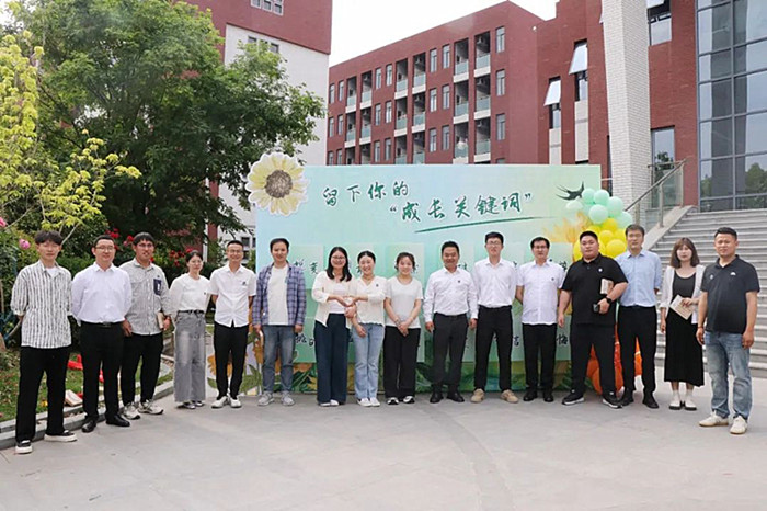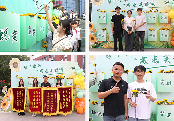 散场后,同学们在“成长关键词”主题墙前驻足,将手中的向日葵投入“勇敢”“探索”“坚定”“温暖”等词框。金色的花盘层层叠叠,每一朵都在诉说即将启程的远方。那三年前深埋沃土的誓言,此刻终在春日绽放成海。
