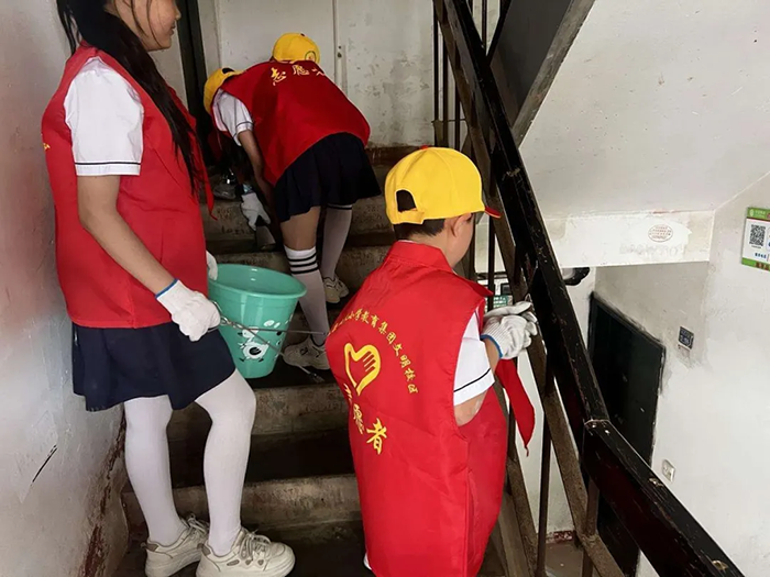 楼道焕新颜:小区楼道里,学生们仔细清理楼道杂物,擦拭扶手,搬运废旧小家具,让原本堆满杂物的公共空间焕然一新。一位参与活动的五年级学生说:“楼道干净了,邻居们走路更安全,心情也会变好!”