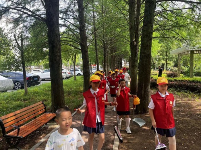 活动当天,20余名学生志愿者身穿红马甲,手持清洁工具,在带队老师和社区志愿者的带领下分组开展行动。