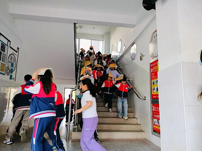 演练开始,随着警报声响起,学生们迅速做出反应。室内学生按照要求,就近躲避在桌下或墙角,用胳膊保护眼睛,抓紧桌腿,以书包等物品护住头部。在第二次警报响起后,学生们在教师的指挥下,用书本等护住头部,有序地从教室撤离到操场指定位置。各年级按照规定区域集合,整个过程迅速且秩序井然。到达操场后,学生们蹲下保护头部,各班立即清点人数,并逐级上报。