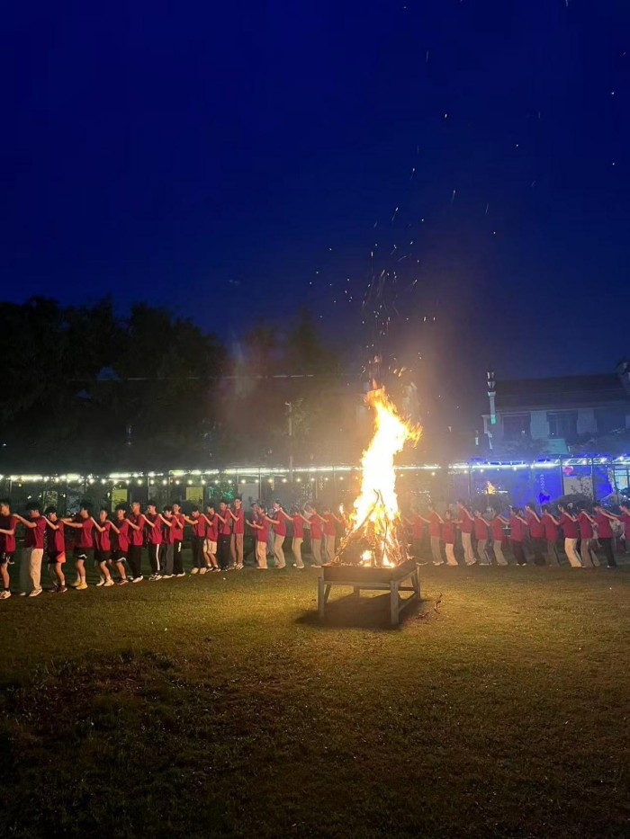 当最后一缕晚霞隐去,篝火轰然跃动,照亮每一张洋溢着朝气的面庞。同学们与老师一起手挽手跳起欢快的集体舞,跃动的身影与火焰交相辉映,合唱声浪此起彼伏,泪光与笑容共同诠释着毕业的双重温度。