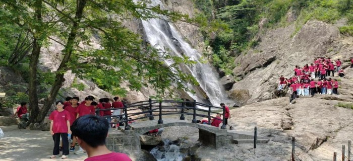 初夏的峡谷宛如水墨长卷:飞瀑如银练垂落深潭,彩虹桥横跨翡翠般的溪流,两岸青松、修竹与苍岩相映成趣。学子们沿石阶溯溪而行,40班一名同学在瀑布下驻足感慨道:“水花溅到脸上时,中考的焦虑好像突然被冲散了。”徒步中,师生们时而在观景台合影,时而在溪边戏水,青春笑语与泠泠泉声在山谷间交织回响。