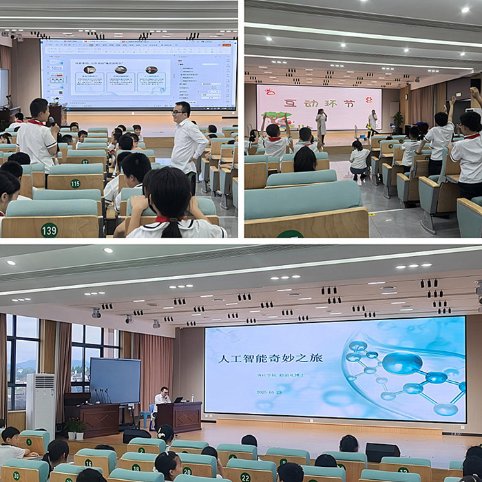接着,黄山学院赵前礼博士给六(1)、(2)、(3)班同学带来了人工智能科普讲座。赵前礼博士以“我的朋友是AI”短视频开篇,通过“什么是人工智能”“会走路的人形机器人”等前置问题深入浅出讲解人工智能的监督、无监督、强化学习等性质。“AI知识抢答”环节,同学们快速识别AI现场生成的图片内容,在趣味盎然的抢答中实现了与AI的积极对话。