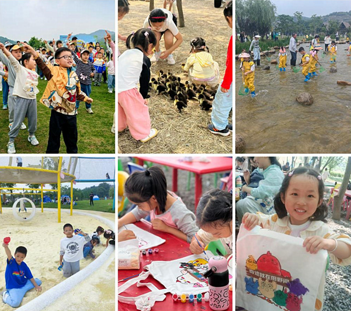 活动伊始,景区导师以一场充满活力的“开营仪式”点燃全场热情。孩子们在互动游戏中迅速拉近距离,随后开启丰富的研学之旅。“绳网沙坑大闯关”项目中,孩子们在高低起伏的绳网间攀爬跳跃,沙坑中奋力冲刺;“拯救鸭宝宝”则让孩子们化身“小小守护者”,寻找与自己最有缘的鸭宝宝,并带回家中呵护成长;“池塘抓鱼”环节成为全场焦点,孩子们踏入清凉的池水,手持渔网屏息凝神,欢笑声与惊呼声此起彼伏,家长们也跃跃欲试,与孩子共同在池水中嬉戏。农庄还设置“绘画帆布包”创意工坊,孩子们以彩色的画笔填涂心中的自然美景,将独一无二的作品作为节日纪念。