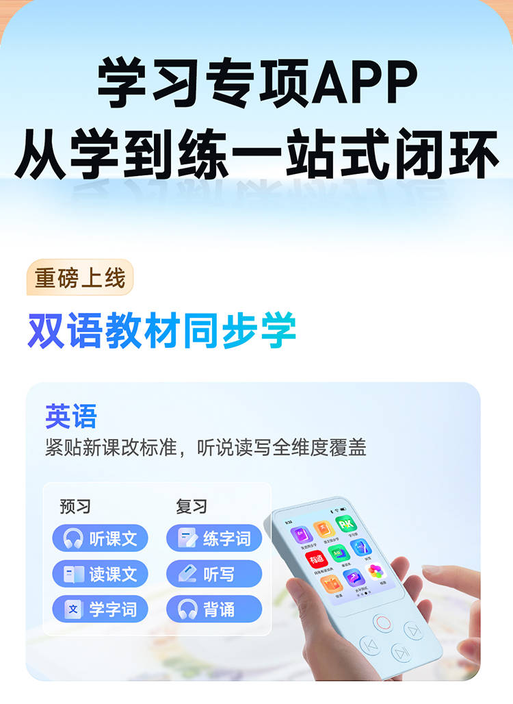 在行业顶配的硬件升级之外,有道听力宝E7 Pro还以丰富的专项学习APP矩阵,达成了学习、练习、考试评测的关键闭环。