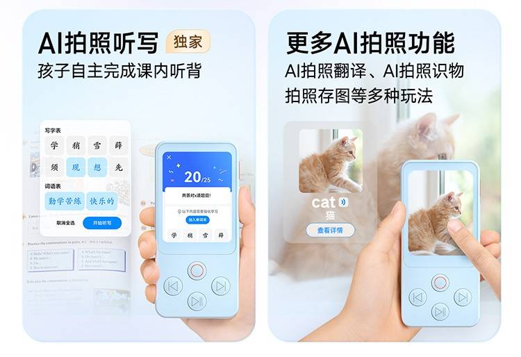 有道听力宝E7 Pro的亮点不仅在于品类中最大的高清护眼屏幕(莱茵低蓝光认证)、同类产品中极致的超薄超轻(净重90克挂脖携带无压力),更在于首次配备的AI摄像头,凭借国内首个教育大模型“子曰”的加持,实现了识别率、准确率的大幅提升,由此呈现多种新颖高效的学习方式。
