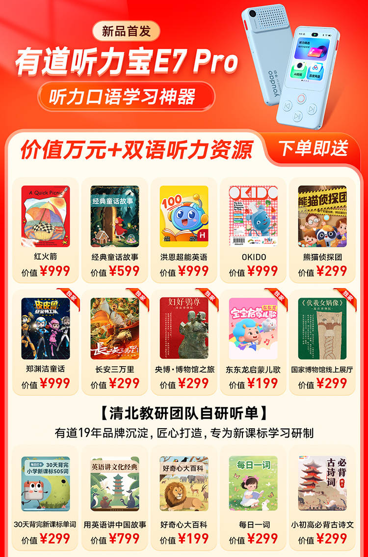 重磅的专项学习APP大放送之外,更有价值万元的海量双语听力资源,如洪恩超能英语、红火箭、清北教研团队自研每日听单,以及博物馆之旅、郑渊洁童话、长安三万里等丰富的IP文化资源,让这个刚刚上市的听力口语练习高科技产品,真正成为了一款高性价比的学习神器。