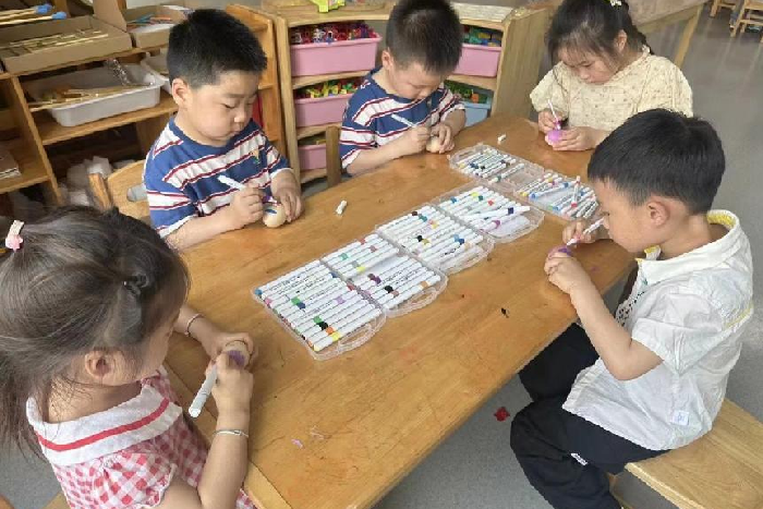中班的小朋友们迎来了“画彩蛋”的趣味挑战。蛋壳在孩子们的手中,变成了独一无二的艺术画布。他们用画笔勾勒出精美的图案,有的画上了鲜艳的花朵,仿佛把整个春天都装进了彩蛋;有的画上了可爱的小动物,赋予彩蛋灵动的生机。孩子们专注的神情,像极了一个个小艺术家,精心描绘着属于自己的端午彩蛋。这些彩蛋不仅承载着孩子们的创意,更传递着端午祈福纳祥的美好寓意。