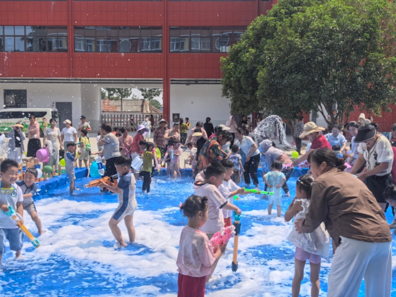 中心幼儿园开展水上趣味活动庆六一。孩子们与家长欢聚一堂,在水花与欢笑中,共同谱写充满童趣的夏日乐章。游戏中,幼儿与家长手牵手踏入水池,将一瓢瓢清水泼向老师。晶莹的水花在空中飞溅,寓意幸福的水花传递着孩子们对老师的敬爱与感恩。 随着泡沫机的启动,大片大片洁白的泡沫如雪花般喷涌而出,瞬间将水池变成了梦幻的泡沫王国。孩子们在泡沫中欢呼雀跃,有的追逐嬉戏,有的尽情打滚。欢笑声、尖叫声此起彼伏,整个幼儿园都沉浸在欢乐的海洋中。泼水活动与水球大战将欢乐推向高潮。大家手持水枪、水盆激烈“对战”。清凉水花四处飞溅,水球炸裂声与欢笑声交织,每个人脸上都洋溢着畅快的笑容。