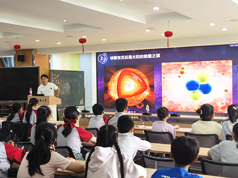 讲座现场,叶扬先用视频介绍了自己的工作场所和工作项目,为孩子们展示了科学岛与大科学装置的容貌,告诉同学们他现在的工作是“制造一个太阳”产生光和热,让这个曾经的幻想成为科学现实。