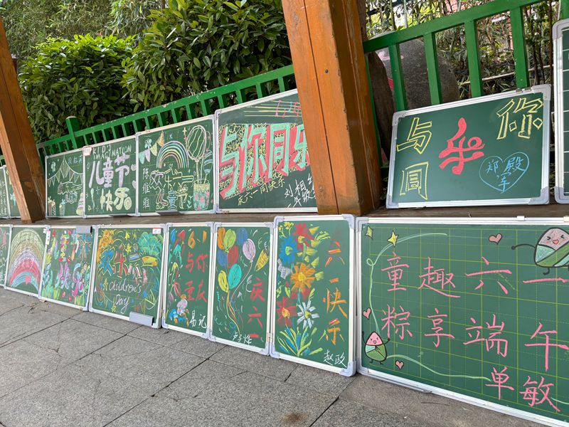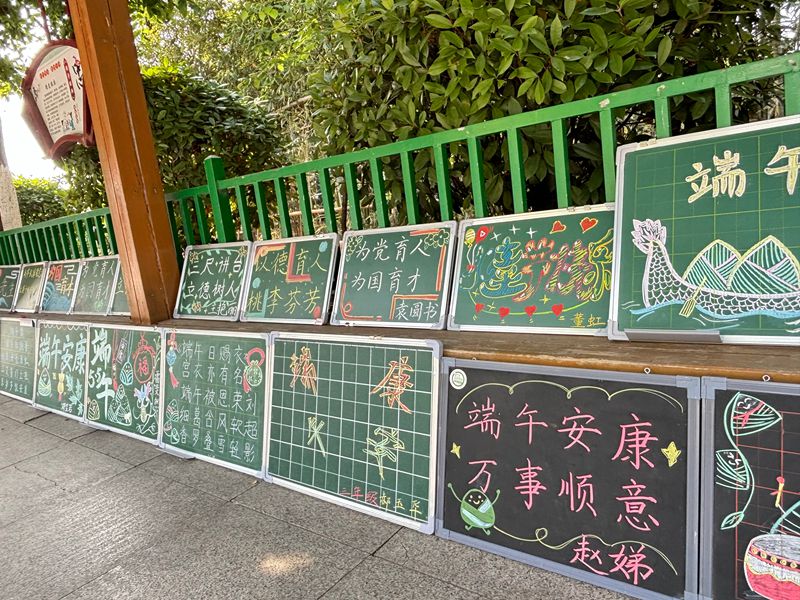 教师们根据学段特点拟定的主题创作,成为本次展览的亮点。一二年级教师以“童心向党,快乐六一”为主题,用卡通化的绘画语言和明快的色彩,设计出充满童趣的教学范画,既贴合低段学生的认知特点,又融入了节日的教育意义。三四年级教师深耕“端午情,文化根”主题,通过书写端午诗词,绘制端午元素的简笔画,将传统文化教育融入艺术创作,引导学生在笔墨中感受节日的文化内涵。五六年级的老师则以“牢记八项规定,树立新风正气”为主题,通过硬朗顿挫的粉笔字将廉政教育与艺术教学结合,传递积极向上的价值观,为高年级学生树立思想引导的典范。