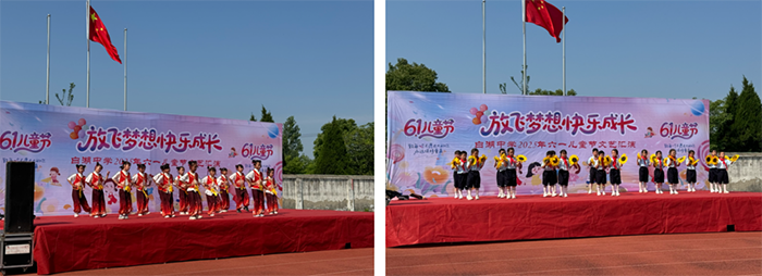 仪式结束后,以“放飞梦想 快乐成长”为主题的庆六·一文艺汇演正式开始。汇演在活力四射的开场舞《小花朵》中拉开帷幕,孩子们用灵动的舞姿瞬间点燃现场气氛。舞台上,节目形式多样、精彩纷呈。诗歌朗诵《少年中国说》铿锵有力,同学们以激昂的语调、饱满的情感,诠释了少年的责任与担当,传递出对祖国的无限热爱;歌曲《当离别开出花》涵盖了吉他演奏与流行金曲,同学们清澈的嗓音与真挚的情感,唱出了童年的纯真与美好。此外,篮球表演、乐器合奏等节目也轮番上阵,将汇演一次次推向高潮。