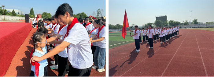 活动在一场意义非凡的入队仪式中拉开序幕,43名朝气蓬勃的同学光荣加入中国少年先锋队。入队仪式在激昂的出旗曲中拉开序幕,护旗手们迈着整齐有力的步伐护送队旗入场,全体同学庄严肃立,向队旗致以崇高的敬意,展现出对少先队组织的无限向往和热爱。