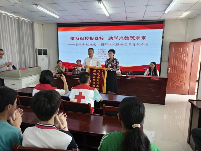 仪式上,怀宁县教育局党委委员高莉萍代表学校向袁朱明赠送锦旗。