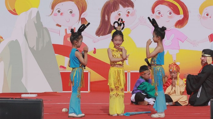 随后,文艺汇演正式开始。《童年向阳生》《西游魔幻三重奏》《童心向党》《金色童年》《俏花旦》《勇气汤圆》《菊次郎的夏天》《弦歌贤文》《加油AMIGO!》《中华少年郎》《帕莎女孩》《和母校说再见》等12个节目精彩呈现,涵盖了歌曲、舞蹈、器乐、戏曲、合唱、经典诵读、啦啦操等多种形式。孩子们用优美的舞蹈演绎未来,用动感十足的啦啦操展现新城校区学子奋发向上、阳光自信的风采。他们尽情地释放童心和纯真,尽情地演绎新时代少年儿童朝气蓬勃的精神风貌。