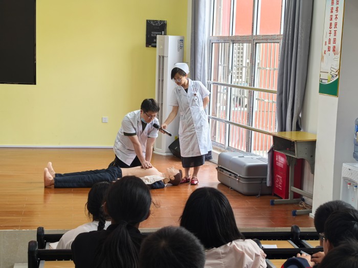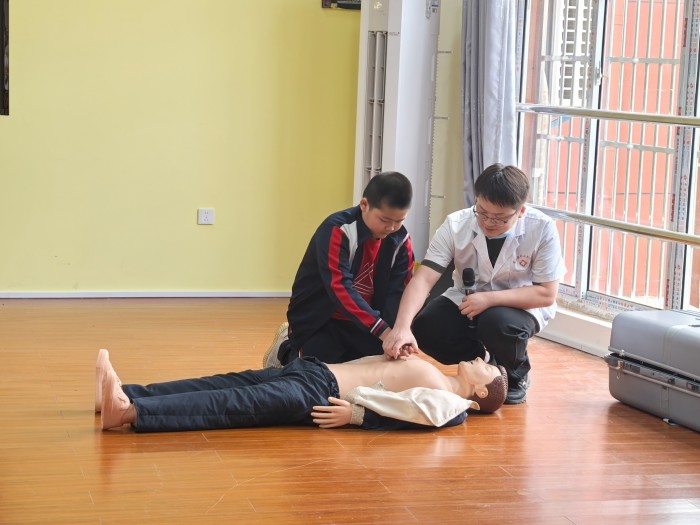 随后,计医师进行了医师急救法的演示,展示了如何在紧急情况下迅速而有效地进行急救操作。他的演示动作规范、流畅,赢得了在场师生的阵阵掌声。为了加深师生们对所学知识的理解和记忆,计医师还请学生上台进行实操演示。在计医师的指导下,学生们认真地模仿着每一个动作,努力将所学知识转化为实践能力。