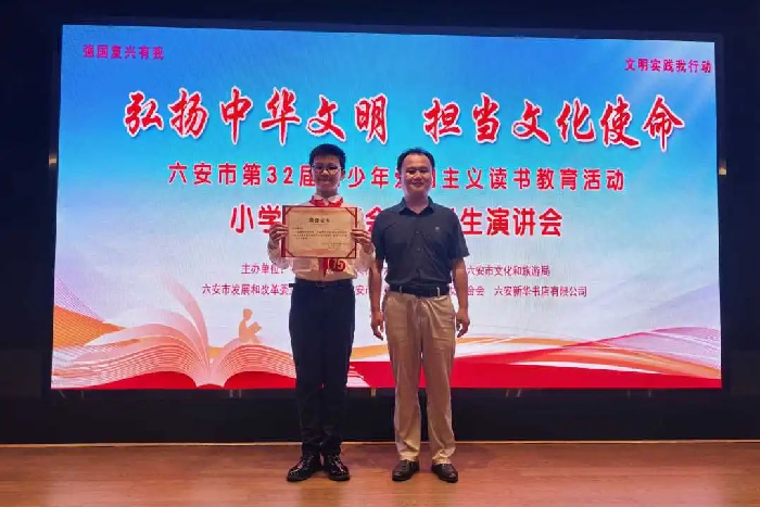 6月4日下午,六安市第32届青少年爱国主义读书教育活动中学生演讲比赛圆满落幕。六安九中七(2)班孙宇轩同学代表裕安区参加比赛,以总分96.00分的优异成绩,实力突围,荣膺市级一等奖,成功晋级省赛。