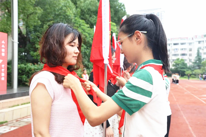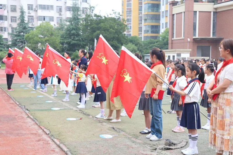 仪式在激昂的《出旗曲》中拉开序幕。大队旗手高举队旗,与护旗手迈着坚定的步伐入场。全体队员齐唱队歌,嘹亮的歌声展现了队员们蓬勃的朝气。在宣读学校大队部决定后,优秀少先队员代表上前为新队员们佩戴上鲜艳的红领巾。当红领巾系在胸前,新队员们身姿挺拔,脸上写满自豪。
