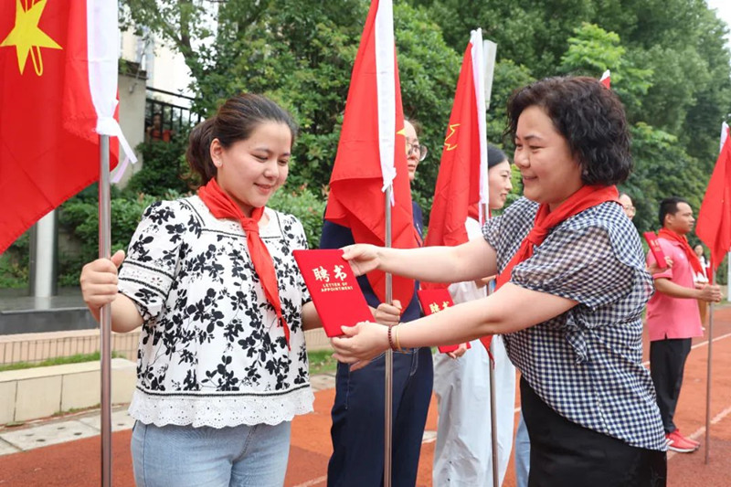 合肥市琥珀名城小学教育集团党总支委员、少工委副主任、副校长张咏梅为一年级新建中队授中队旗,颁发聘书。张咏梅勉励新队员们牢记红领巾的责任与使命,从小树立远大理想,勤奋学习,锻炼体魄,争做强国好少年。