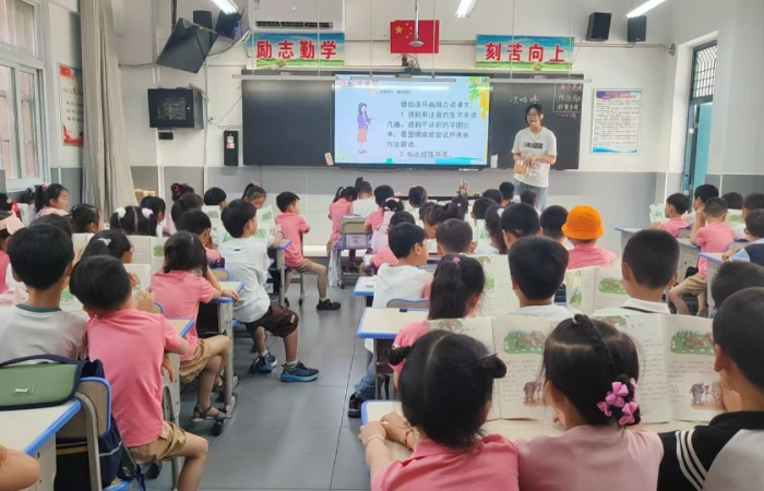 在小学报告厅,学校通过宣传片带孩子们“云游”图书馆、美术室等校园空间,看到丰富功能教室时,孩子们欢呼 “小学真有趣”。一(4)班学生展示课前准备流程,幼儿纷纷模仿。“记得多喝水”“勇敢面对挑战”,一年级学生的叮嘱与幼儿园教师的祝福交织,构建起幼小衔接的情感纽带。