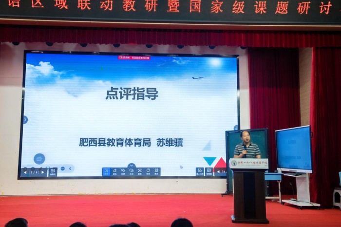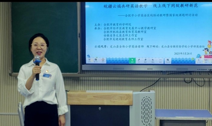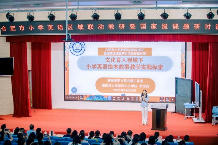 工作室主持人、肥西县上派学区中心学校李文英作题为《文化育人视域下小学英语绘本故事教学实践探索》分享。李文英针对英语教学中的现状与问题,结合丰富的教学实例,解析了通过融合绘本资源培育学生文化意识的具体方法与策略,展示了肥西县小学英语“文化育人”教学研究项目的丰硕成果与显著成效。