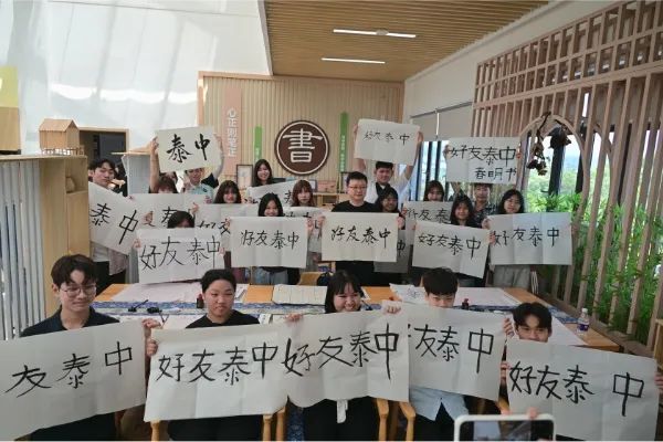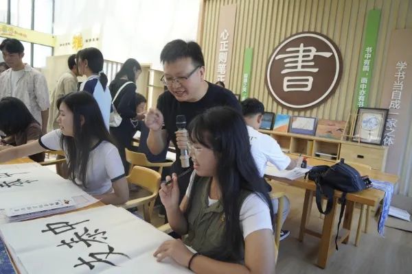 校园美育空间内,一场“笔墨丹青 中泰友好”书法体验活动吸引了双方学子。学校书法社团指导教师邱仁伟向泰国学生讲解了中国书法的千年历史,并就书圣王羲之的《兰亭序》和现场同学进行了“拍卖询价”趣味互动。“一横一竖皆风骨,一撇一捺见精神。”体验环节,邱仁伟现场挥毫,行云流水写下“中泰友好”四个大字,引得泰国师生拍手称赞。他还与书法社的学生现场示范书法写作,指导泰国师生握笔、运墨,两校师生用墨香勾勒出文明互鉴的生动图景。