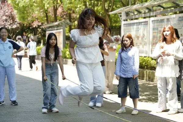 篮球友谊赛中,双方队员攻防有序,泰国学生以灵活战术见长,学校学子凭借默契配合屡屡得分,双方你来我往,突破、传球、投篮,每一个精彩瞬间都引发阵阵欢呼;跳绳比赛则创新融入两绳同用、多人协同、花样接力、花样后空翻等方式,轻盈跃动的身影与加油呐喊声交织成青春的乐章。