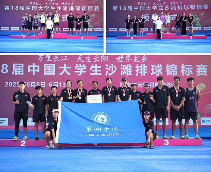 6月8日至13日,第18届中国大学生沙滩排球锦标赛在重庆云阳举行。本次赛事云集了清华大学、山东大学、南京大学等61所高校的116支劲旅。巢湖学院沙滩排球队在激烈角逐中脱颖而出,女子丙A组(体育类招生院校组)勇夺亚军,男子丁组(专业运动员组)斩获季军,同时女子丙B组(高水平运动队组)获得第四名,并荣膺体育道德风尚奖,实现了运动成绩和精神文明双丰收。