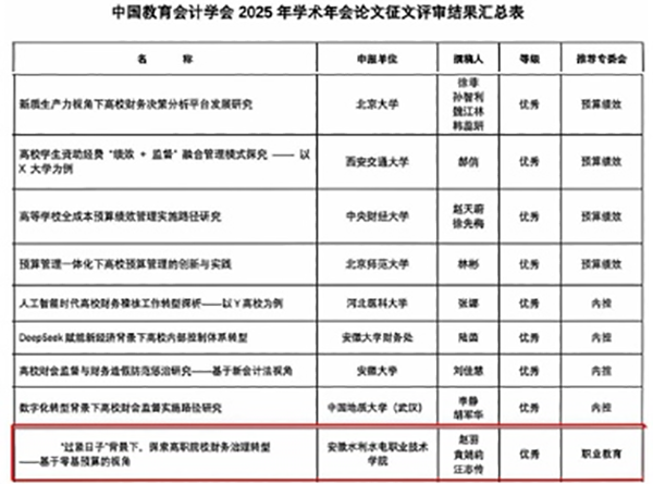近日,中国教育会计学会公布2025年学术年会论文评审结果,安徽水利水电职业技术学院提交论文《“过紧日子”背景下探索高职院校财务治理转型——基于零基预算的视角》获评优秀论文。