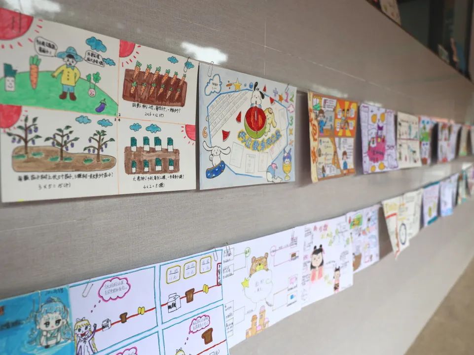 为营造浓厚的数学文化氛围,全校师生精心准备,在教室外布置了丰富多彩的数学作品展。展区里,既有充满童趣的"图形创意画"和精巧的"时钟小工匠"作品,又有生动有趣的"数学连环画"和实践性十足的"垃圾分类"数学小报;既有独具匠心的"数学文化节徽章"设计,又有富有创意的"圆的梦幻创造"作品,处处展现着孩子们对数学的热爱与创意。