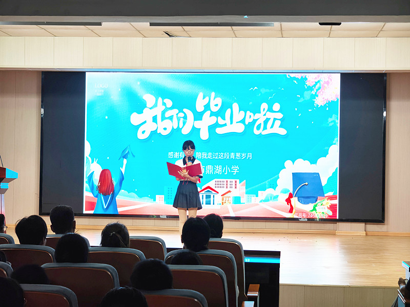 随后,毕业生代表付旻怡怀着激动的心情走上舞台发言。她用真挚的语言,讲述了在鼎湖小学六年学习生活中的难忘瞬间,分享了与老师、同学相处的美好回忆。感谢学校的培养,感谢老师们的辛勤付出,也感谢同学们的陪伴。并表示在未来的日子里,将牢记母校的教诲,不负韶华,努力拼搏,以优异的成绩回报母校、回报社会。毕业生代表的发言,道出了全体毕业生的心声,引起了大家的强烈共鸣。