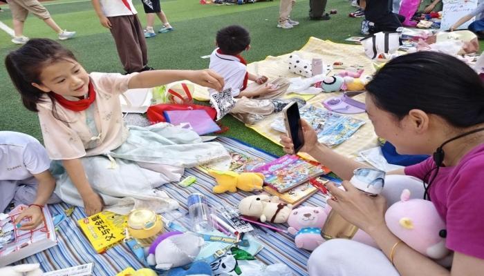 活动现场热闹非凡,同学们纷纷化身“小摊主”和“小顾客”,在琳琅满目的商品摊位前流连往返。整个操场熙熙攘攘,师生们一起体验了一场别开生面的社会实践活动,为校园增添了一抹别样的活力色彩。