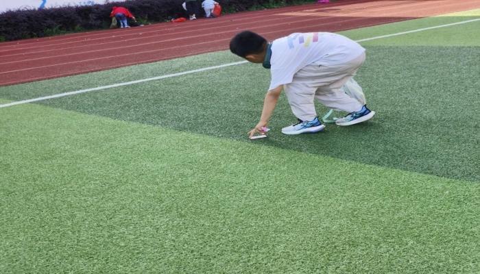 操场上还有一些同学积极清理操场垃圾。他们有的负责捡拾垃圾,有的负责搬运垃圾袋,很快就将操场恢复了整洁。这些同学用自己的双手维护了校园环境,更以实际行动为全校师生树立了榜样,让文明之风在校园吹拂。