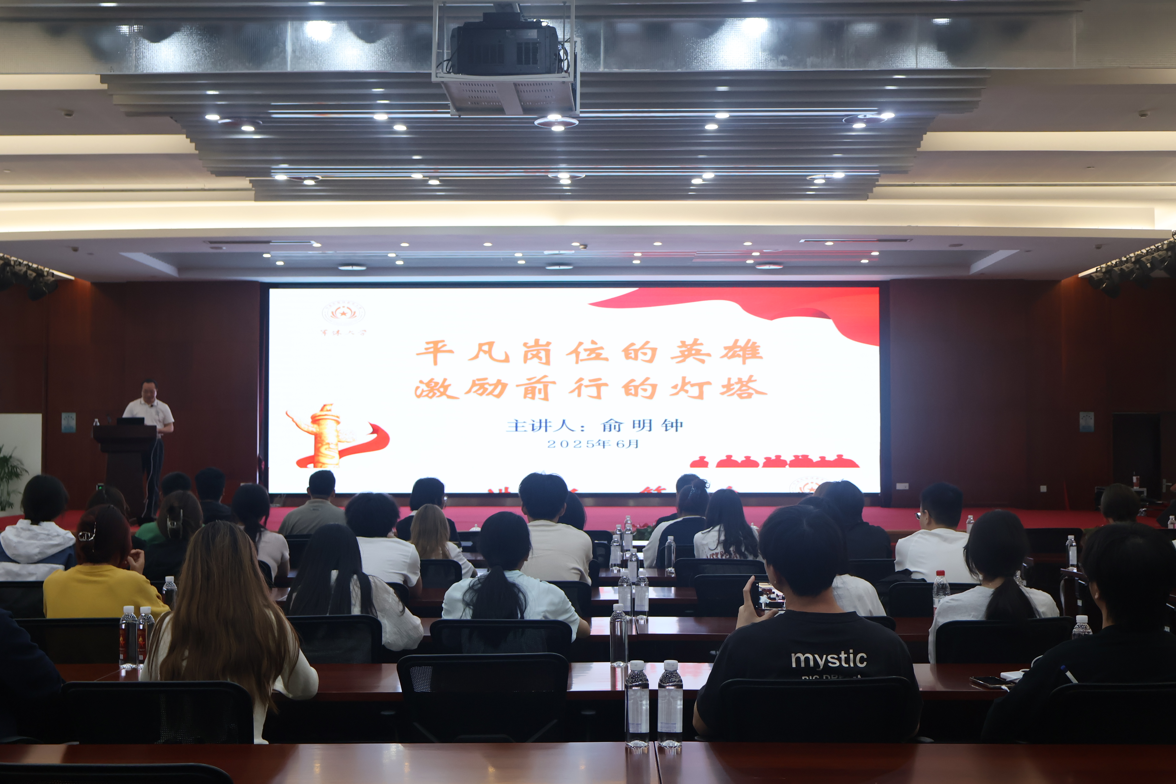 在报告厅,“红烛思政”讲师、宁波市“银辉”金牌讲师俞明钟以“平凡岗位的英雄 激励前行的灯塔”为题,深情讲述平凡岗位上的英雄故事。当讲到广西消防员杨科璋从火场坠落时仍将两岁女童紧护怀中,用身体充当“救生垫”英勇牺牲;北海边防所长骆春伟咬住缆绳跃入火海保住560艘渔船,自己却再未归来等场景时,俞明钟几度哽咽,台下师生肃然动容,现场响起阵阵掌声。
