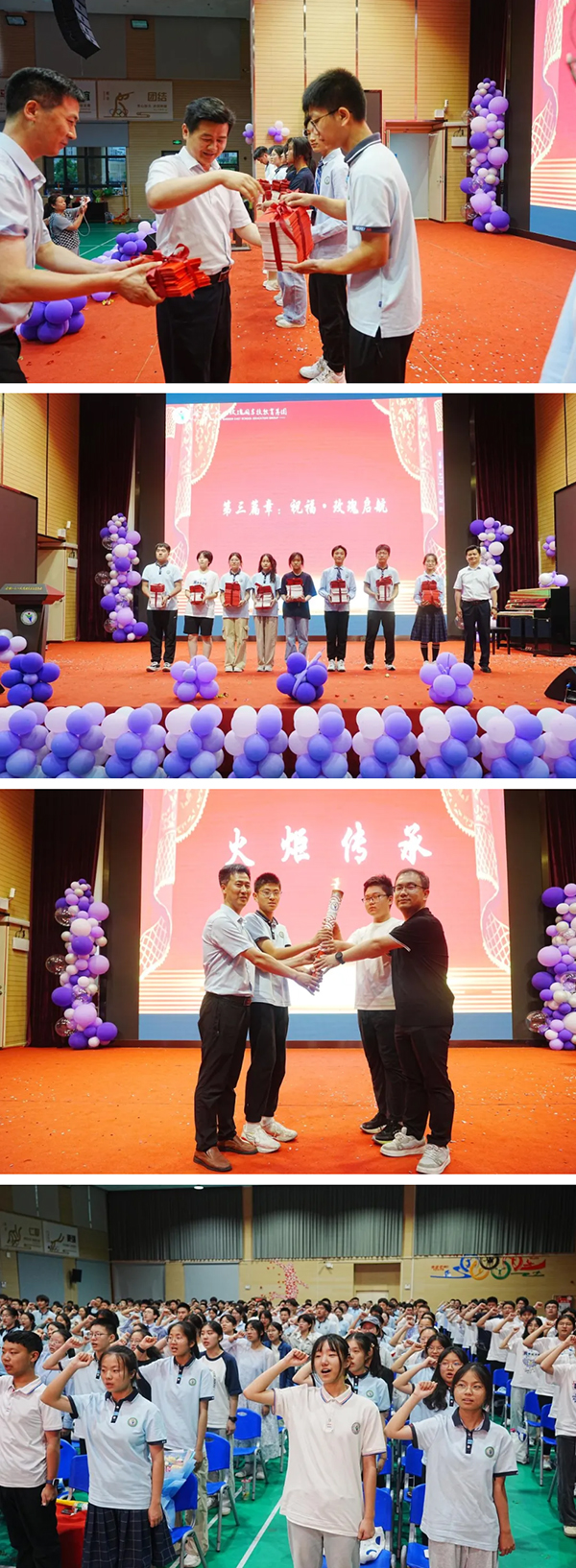 暮色为会场镀上金边,鼓乐齐鸣中九年级学子踏过红毯、穿过毕业门。第一篇章“感恩·玫瑰拾光”,伴随着朗诵声,学生代表向32位教师献花并深深鞠躬,还有家长代表接过鲜花时颤抖的双手,让感恩之情在泪光中升腾;第二篇章“传承·玫瑰和美”,火炬从毕业生传向八年级学子的瞬间,火光映照的不仅是脸庞,更是玫瑰精神的代际接力;第三篇章“祝福·玫瑰启航”,校长颁发毕业证时“带着宪法远行”的嘱托,全场师生齐唱校歌的声浪,将现场的热烈气氛推向高潮。